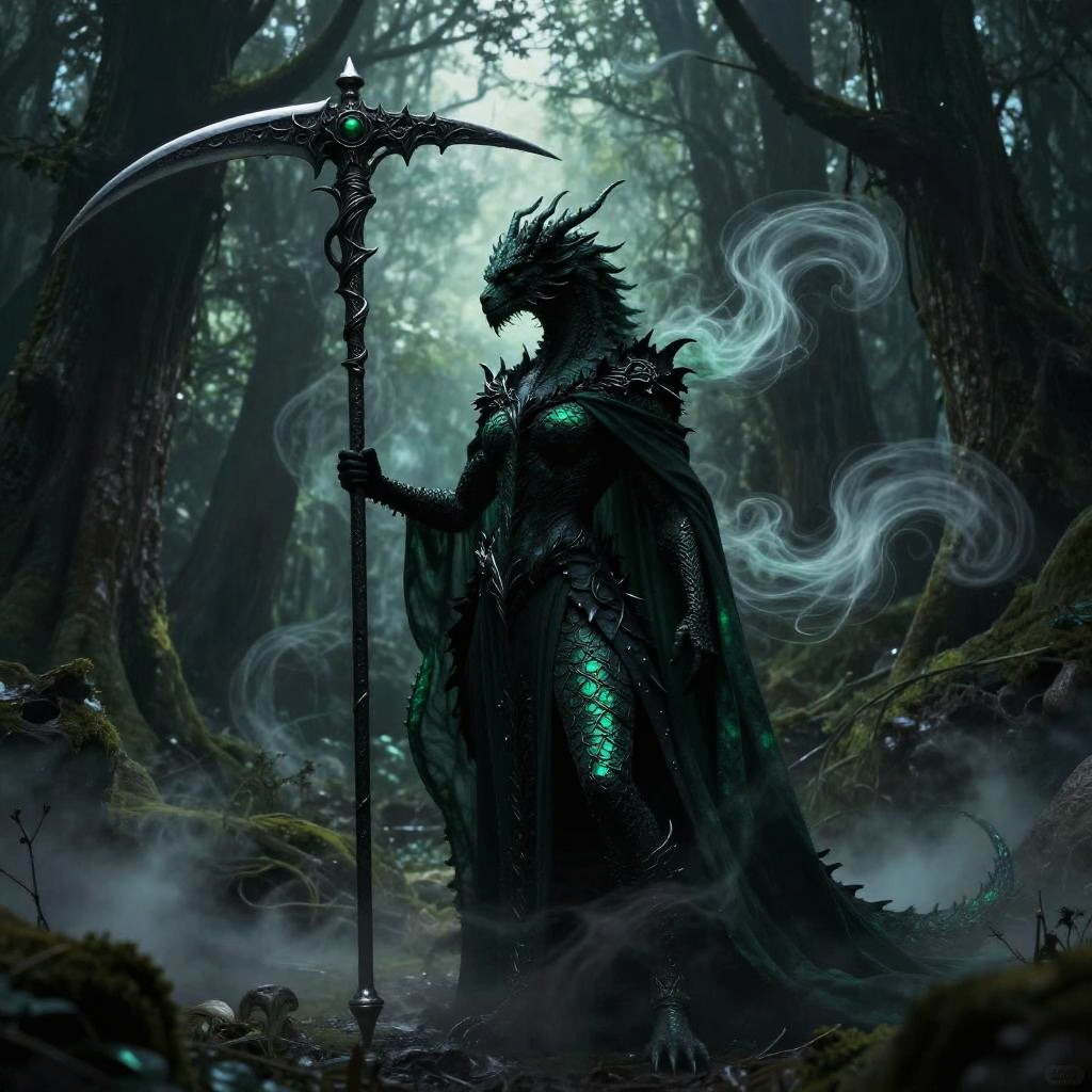 Digital artwork of a fierce, green-scaled, dragon-like warrior standing in a dense, enchanted forest. The creature has large, translucent wings with glowing green patterns, and sharp, metallic armor adorned with green gems. It holds a staff topped with a glowing green crystal in its right hand. The background features tall trees, dappled sunlight filtering through the leaves, and moss-covered rocks. The dragon's eyes and scales emit a bioluminescent green light, adding a mystical aura to the scene. The artwork combines fantasy and realism, with intricate details and vibrant colors.