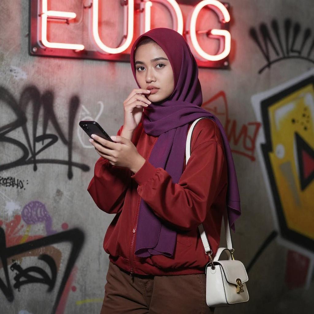 Photograph of a young Asian woman with light skin and dark hair, wearing a red hijab, red jacket, purple scarf, and brown pants. She stands against a graffiti-covered wall with a neon red sign, holding a smartphone in her right hand and touching her lips with her left. She has a confident expression and a small white bag hangs from her shoulder.