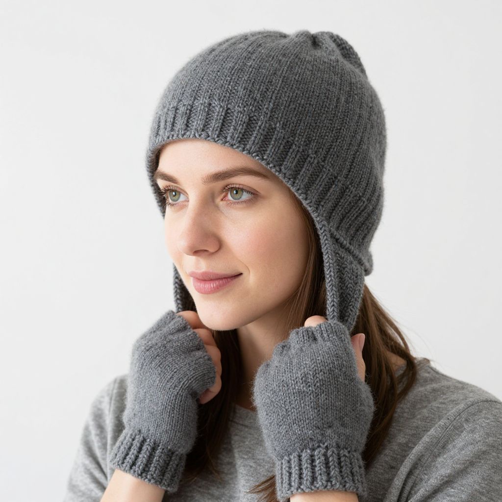 Photograph of a young woman with light skin and green eyes, wearing a dark gray knit beanie and matching fingerless gloves. She has straight, brown hair peeking from under the beanie and is looking to the left with a slight smile. She wears a gray knit sweater. The background is plain white, making her and her clothing the focal points. The knit texture of her hat and gloves is visible, adding a cozy, winter feel to the image. Her expression is calm and relaxed.