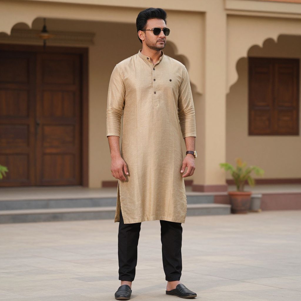 Photograph of a South Asian man with a medium build, dark hair, and short beard, wearing black sunglasses, a shiny gold-colored traditional kurta with three buttons, black trousers, and black slip-on shoes. He stands in an outdoor setting with beige walls, dark wooden doors, and a potted plant in the background. His right arm is relaxed by his side, and his left arm hangs slightly forward. The lighting is natural, highlighting the texture of his kurta and the smoothness of the pavement. The overall style is contemporary yet traditional.