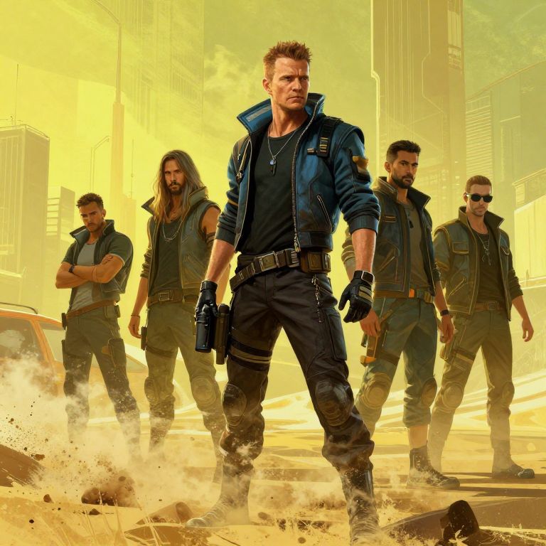 Photorealistic movie poster of muscular, blonde-haired man in blue jacket, black pants, and gloves, leading five similarly dressed men in a dusty,