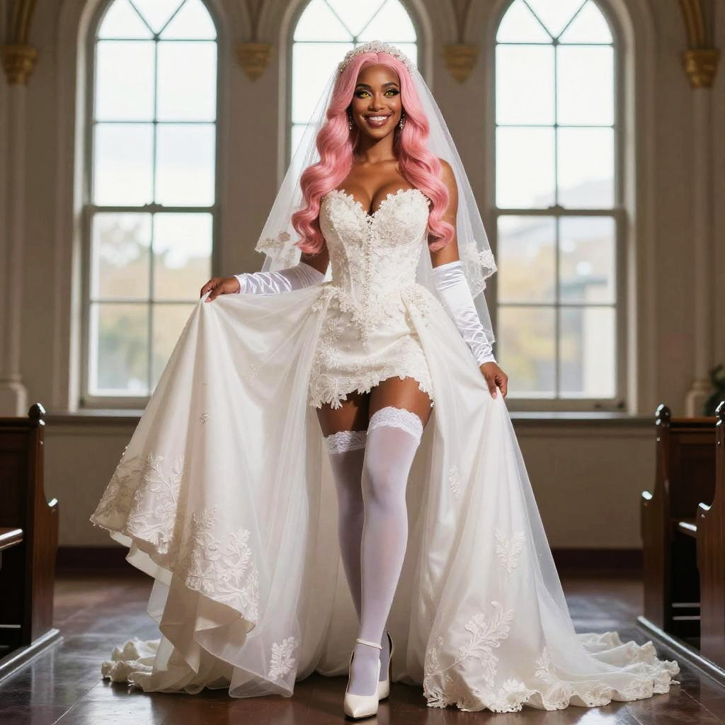 Dark-skinned mature female bride with long pink hair, wearing a detailed white wedding dress with a veil and white thigh-high stockings. She is standing inside a church with large arched windows, holding the sides of her dress, smiling brightly. The bride features makeup, including yellow eyeshadow and lipstick, with a mole under her mouth, and is wearing white high heels and bridal gloves.