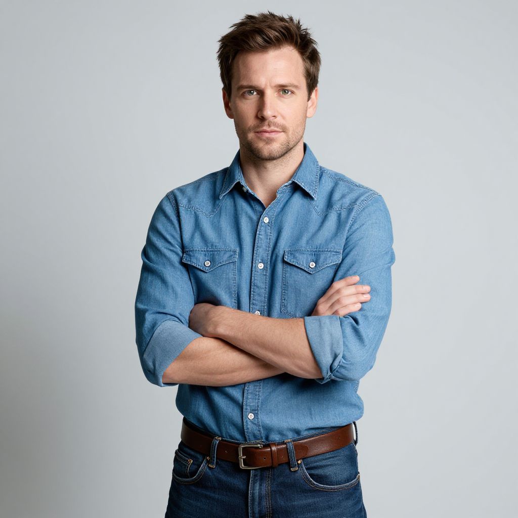 Man with short brown hair, wearing a maroon and yellow shirt with a black belt and gray pants. He is standing with his hands on his hips and looking at the camera.
