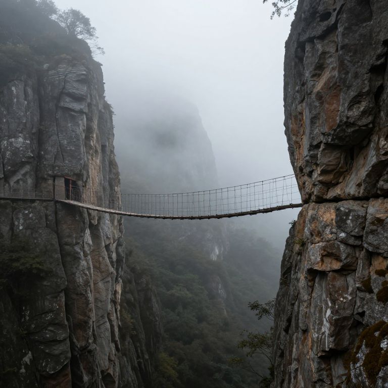 Suspended between ancient cliffs, a delicate bridge of memory and possibility stretches into the misty abyss, inviting introspection on the fragile threads that connect past and future, solitude and connection.