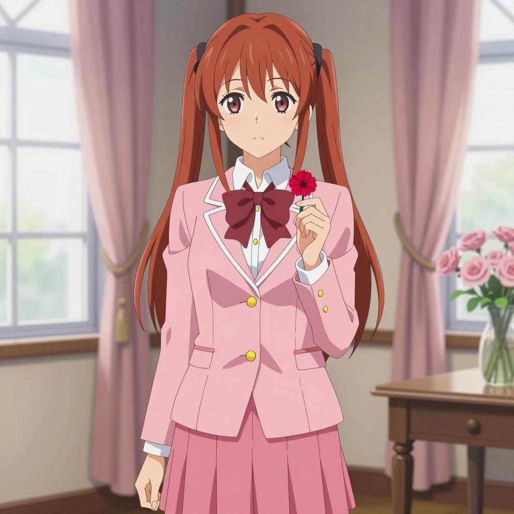 Ouran highschool host club, photorealistic anime-style, young woman, standing, front view, pink school uniform, pink blazer, red bow tie, pink skirt, white shirt, long red hair in pigtails, serious expression, holding small red flower, elegant room, tall windows, light pink curtains, wooden table with pink flowers in the background, soft natural light, detailed ures, realistic shadows