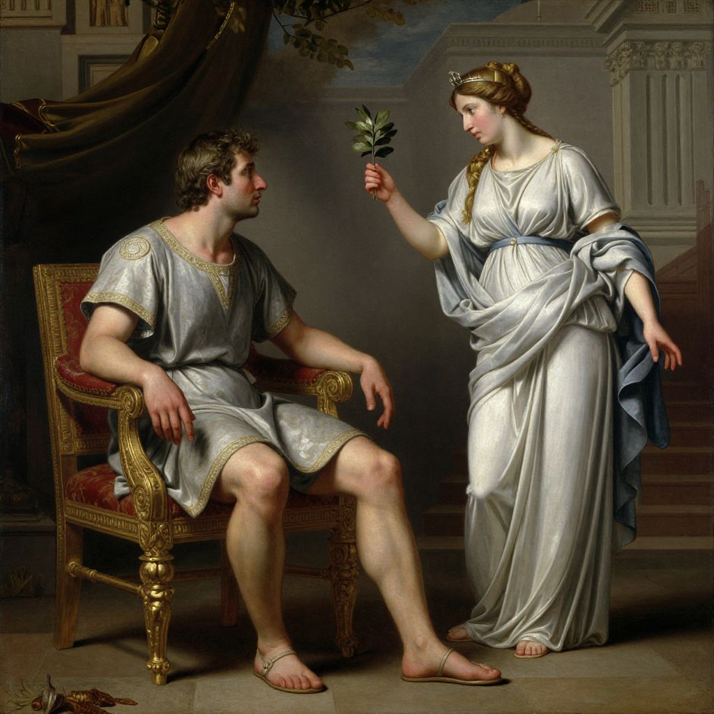 A classical-style digital artwork depicting a serene family moment, featuring a muscular man and a woman adorned in flowing robes, tenderly holding a swaddled infant, evoking the timeless elegance of Renaissance portraiture with meticulous attention to detail and soft, natural lighting.