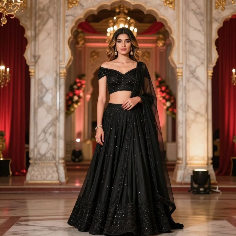 Photograph of a young woman with medium brown skin and wavy dark brown hair, standing confidently in an ornate, marble-columned hall with red drapes and golden chandeliers. She wears an off-the-shoulder, black, sequined crop top and a matching, long, black, tulle skirt with a sheer overlay. She accessorizes with large hoop earrings and a delicate bracelet. The floor is polished marble, and the background includes floral arrangements. The lighting highlights her elegant, traditional Indian attire, creating a glamorous and sophisticated ambiance.