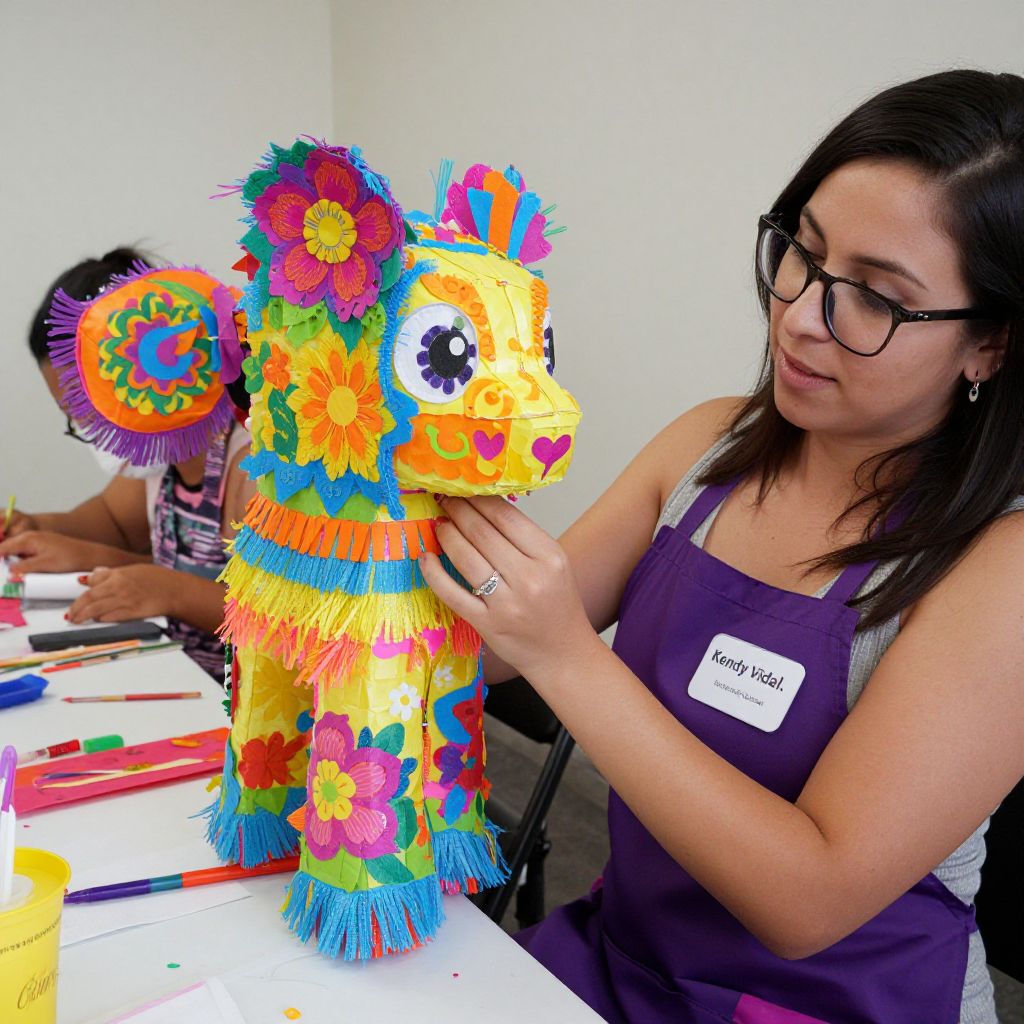 Woman crafting a vibrant, colorful piñata featuring intricate floral patterns and fringed edges at a family-friendly workshop, wearing a purple apron with a name tag that reads \"Kendy Vidal.\