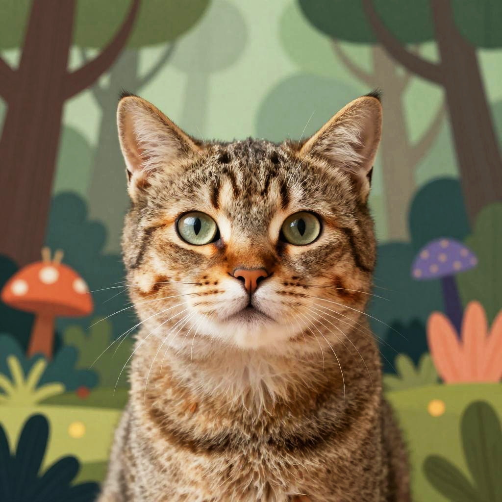 A whimsical illustration of an animal with an unreadable expression, blending realistic and cartoonish styles, colorful forest background with fantastical elements, playful yet puzzling mood
