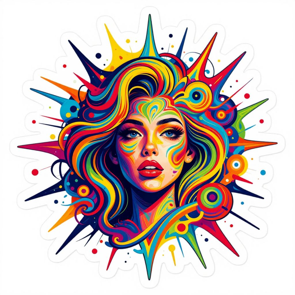 The image is a vibrant, psychedelic sticker featuring a woman's face surrounded by an explosion of colorful, swirling patterns. The woman's hair and face are adorned with a mix of bright hues, including yellow, red, blue, and green, creating a dynamic and chaotic effect. The patterns appear to be in motion, with streaks and splashes of color that give the impression of a burst of energy or a burst of paint. The overall composition is highly detailed, with intricate lines and textures that add depth and complexity to the image. The sticker is outlined in black, which helps to define the edges and enhance the contrast between the vivid colors and the white background. The interplay of colors and shapes creates a sense of movement and intensity, making the sticker visually striking and eye-catching.