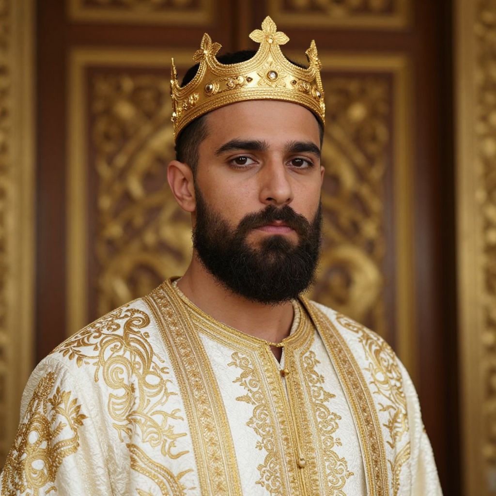 A photograph of a bearded man with a crown, standing in a sunlit courtyard. He's wearing a black velvet robe with gold embroidery over a white shirt and gold belt. The robe has intricate floral patterns. Behind him is a classical building with arches and well-manicured bushes. The man has a serious expression and is centered in the frame.