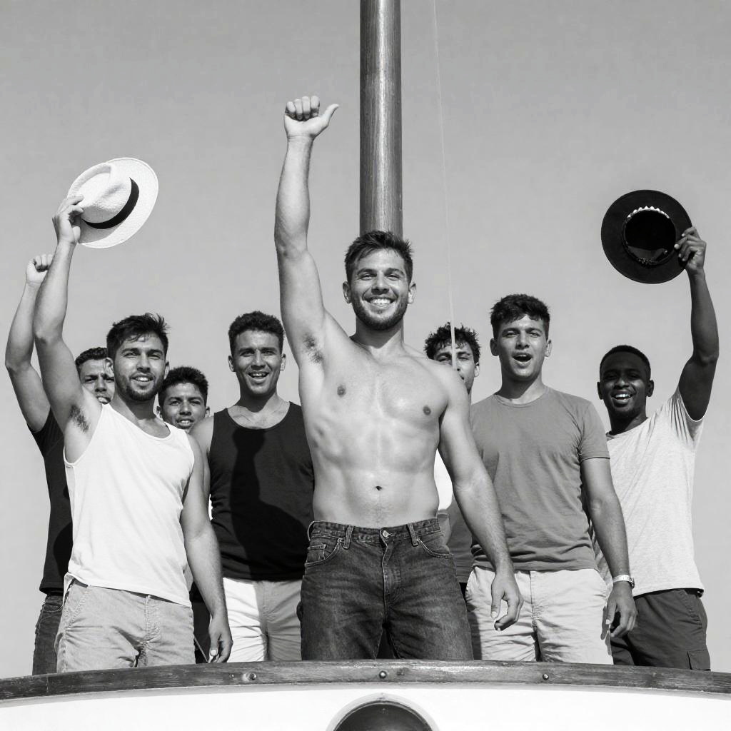 Black-and-white photograph of a group of jubilant men on a boat. Central figure with muscular build, raised arm, and smiling. Others raise arms, hold hats, wear casual clothing. Boat mast in foreground. Clear sky background. 9 people visible, intense expressions of excitement.