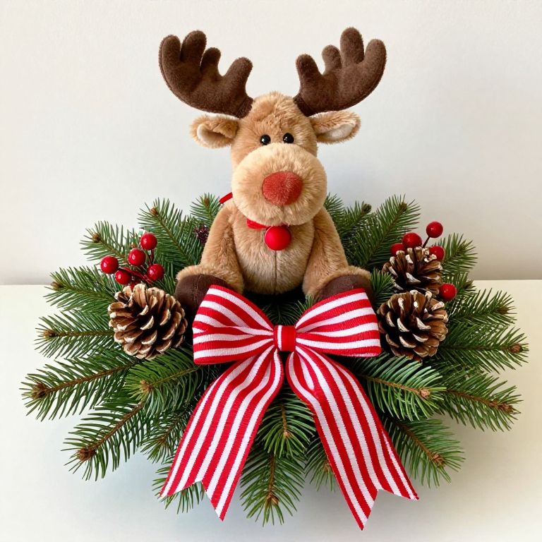 Photograph of a plush reindeer toy with brown antlers, a red nose, and a red ribbon around its neck. The reindeer sits on a wreath made of green pine branches, adorned with red berries and brown pinecones. A large red and white striped bow is at the center of the wreath. The background is plain white, making the colorful elements of the reindeer and wreath stand out. The reindeer's fur is light brown, and its eyes are black and beady. The image is brightly lit, highlighting the textures and colors.