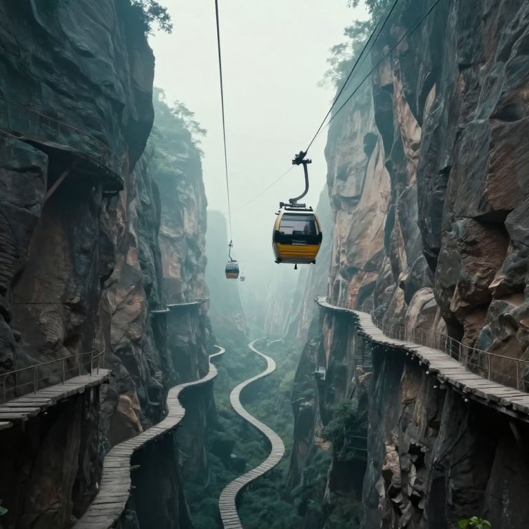 Suspended between ethereal cliffs, a cable car defies gravity as it ascends into a luminous void, where ancient stone pathways seem to float endlessly upward, inviting the viewer into a realm where the laws of physics dissolve into dreamlike possibility.