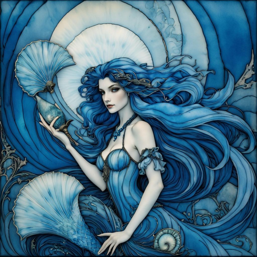 Beautiful mermaid-woman with flowing blue hair holding a conch shell, set in a dark fantasy world. Styled in high detail by Arthur Rackham.