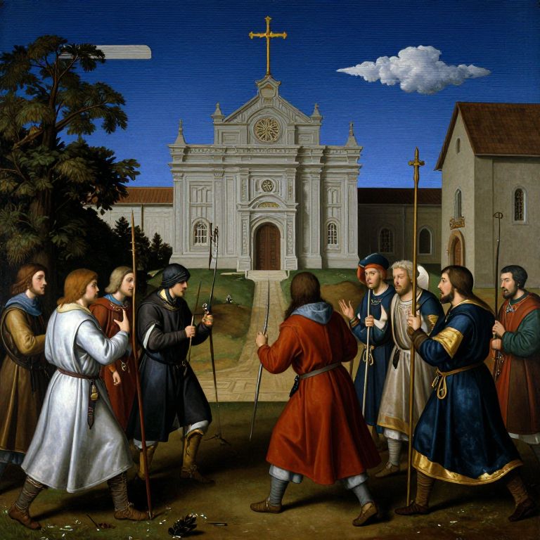 This digital painting depicts a medieval religious scene outside a grand, white baroque-style church with a golden cross on the roof. Eight men, dressed in various medieval garments—white, black, and red tunics with brown boots and hats—stand in a semi-circle, holding staffs. One man, in a red tunic and brown boots, faces them with hands raised in a defensive gesture. The background includes a cloudy blue sky, a small white cloud, and a brown building to the right. The men's expressions range from stern to curious, and the ground is dotted with greenery. The painting has a detailed, realistic style with vibrant colors and intricate textures.
