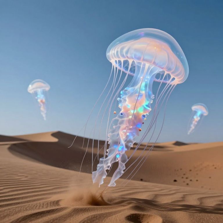 Giant jellyfish drift through a desert sky, their translucent bodies pulsing with bioluminescent sand harvested from shifting dunes.