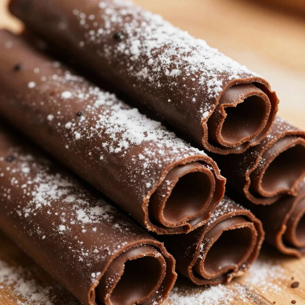 Close-up photo of a stack of chocolate rolls, dusted with powdered sugar. The rolls have a rich, dark brown color with slightly curled edges, giving a textured appearance. The powdered sugar adds a contrasting white speckle across the top. The background is a wooden surface, adding a warm tone to the image. The photo has a slightly high-contrast, almost surreal quality.