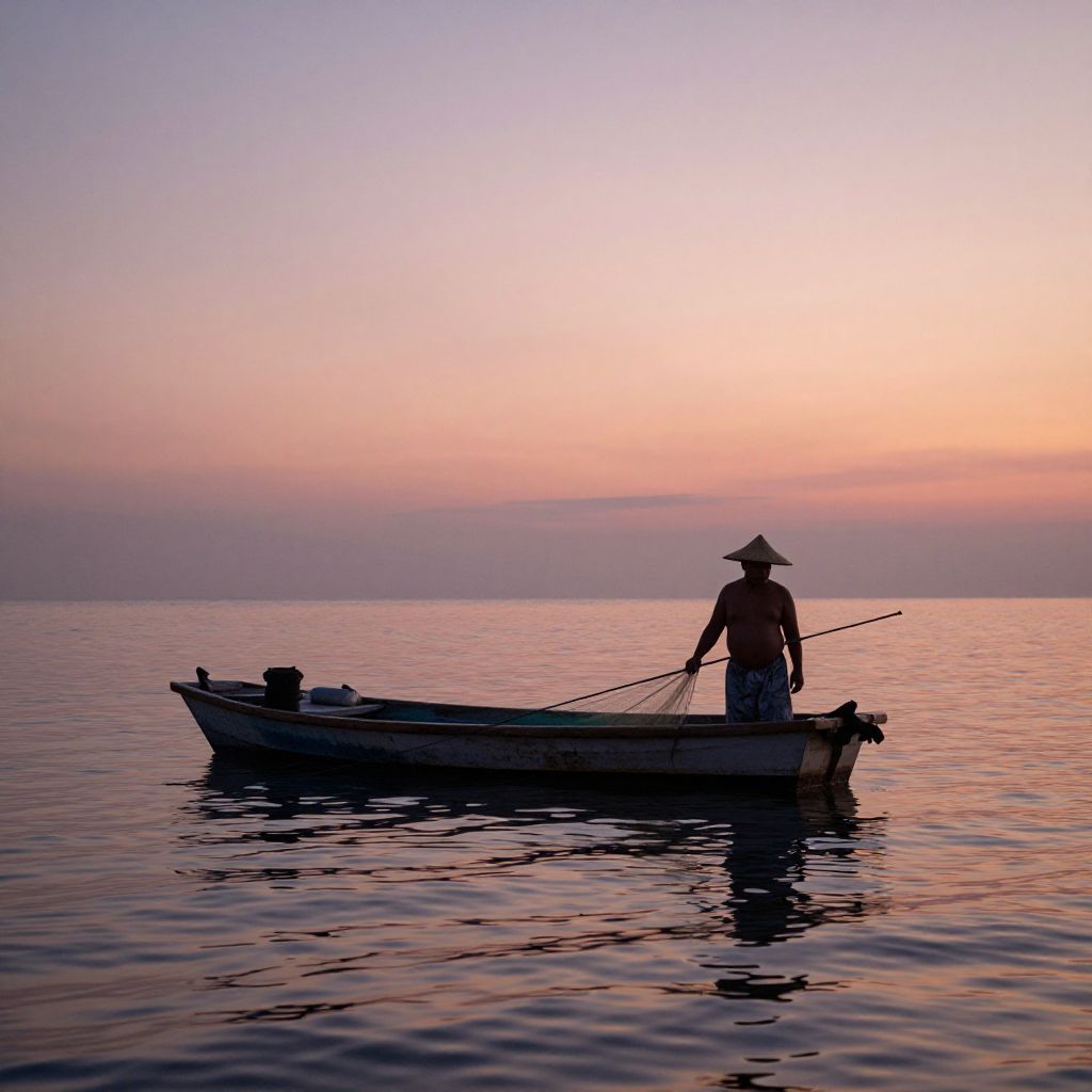 Fat Filipino fisherman on a small wooden boat at sunrise, calm ocean water reflecting pink and orange skies, traditional hat, fishing nets, serene and peaceful environment, highly detailed water texture and sky gradients
