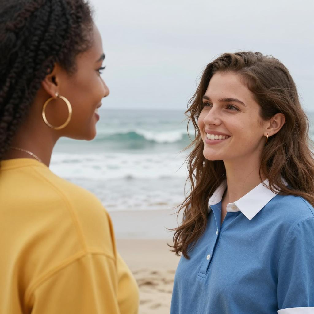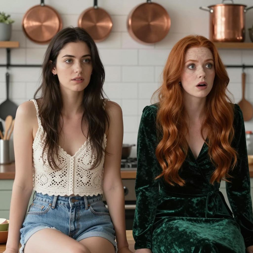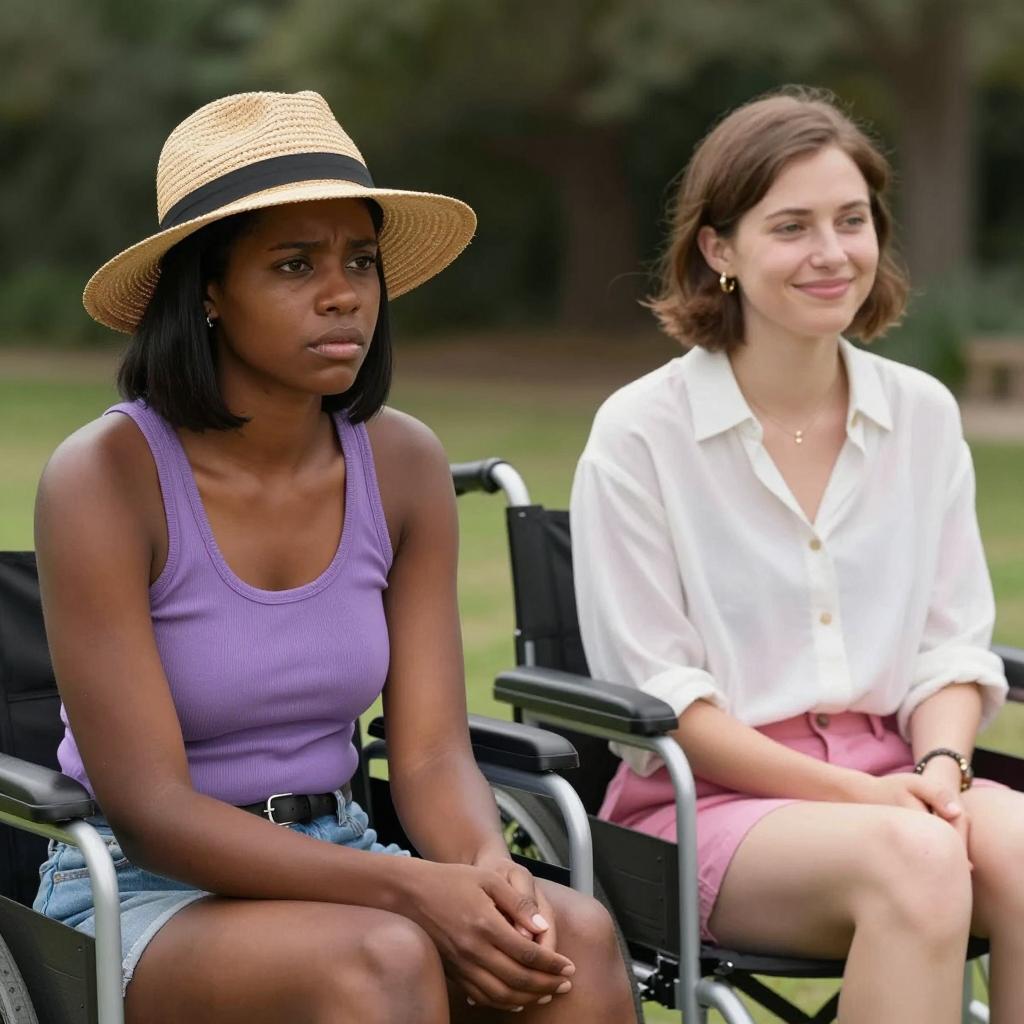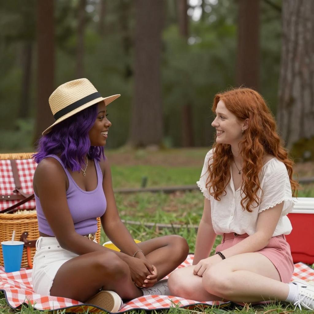 Photograph of two women sitting on a picnic blanket in a forest. One woman with dark skin, purple hair, purple tank top, and white shorts, wearing a straw hat, talks to the other woman with light skin, red hair, white blouse, and pink shorts. Both smile. Picnic basket, blue cup, and red cooler in background. Grass and trees in the background.