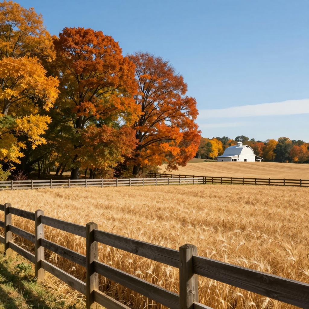 A countryside autumn scene featuring a golden wheat field bordered by a wooden fence. In the background, trees display fall foliage with vibrant orange and yellow leaves under a clear blue sky. A white barn is visible in the distance on gently rolling farmland.