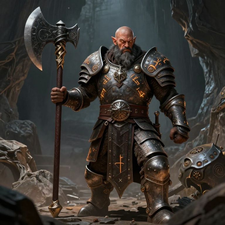 Dnd dwarf art depicting a fierce warrior dwarf clad in intricate heavy armor, wielding a large battle axe, standing in a rocky mountain cave, glowing runes etched on his armor, dramatic lighting showcasing his determined expression, fantasy style illustration