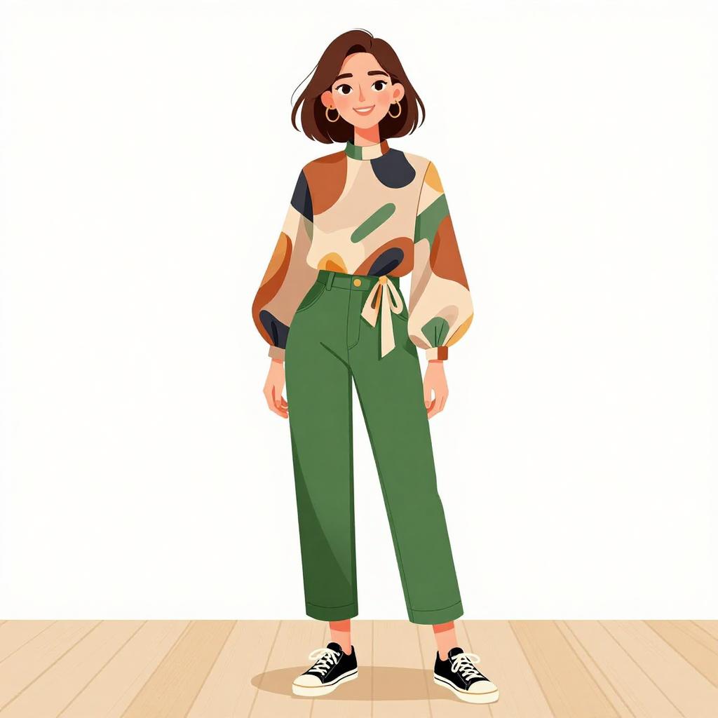 Digital illustration of a young woman with medium-length brown hair, fair skin, and a cheerful expression. She wears a colorful, long-sleeve, abstract-patterned top featuring orange, green, and beige patches. She pairs it with high-waisted, green, cropped pants tied at the waist with a yellow string, and black sneakers with white soles. Her large hoop earrings and subtle makeup enhance her stylish look. The background is plain white, and she stands on a light wooden floor, centered in the image. The art style is vibrant and modern, with clean lines and a playful, contemporary vibe.