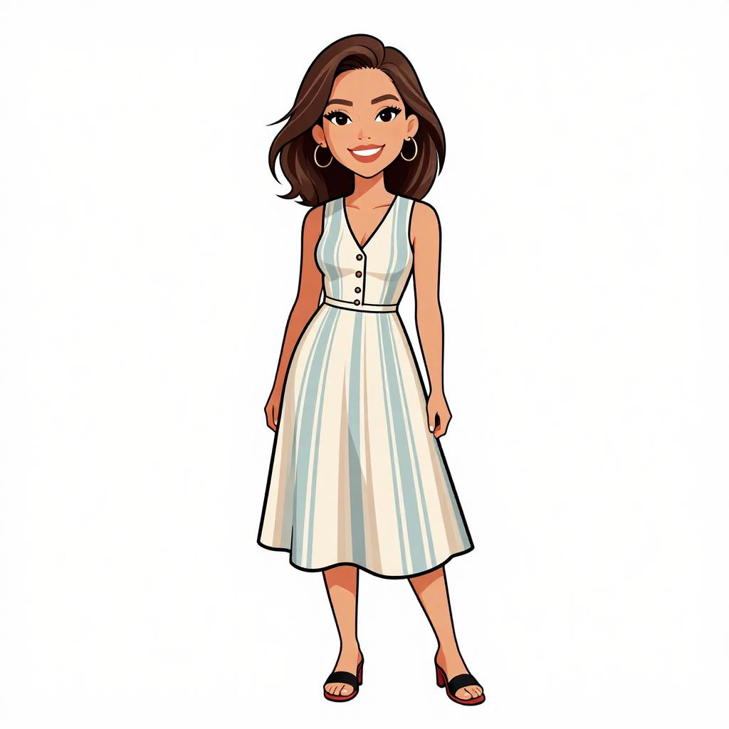 This is a digital illustration of a smiling, young woman with fair skin and long, wavy brown hair. She wears a blue and white checkered, short-sleeved, V-neck dress with a tied waist, and a flared hem. She also has large silver hoop earrings and black, open-toed high heels with ankle straps. The background is plain white, making her the focal point. Her confident stance and bright smile give a cheerful and approachable vibe. The illustration style is cartoonish with bold, clean lines and vibrant colors.