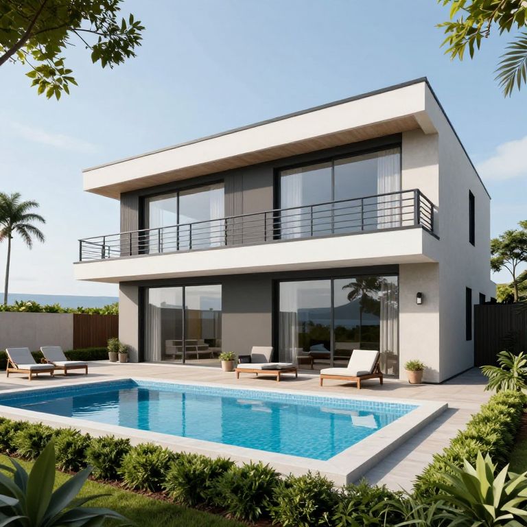 A modernist 3D-rendered luxury residence showcases sleek lines, expansive glass windows, and warm interior lighting, embodying the high-definition aesthetic of contemporary Indian real estate design.