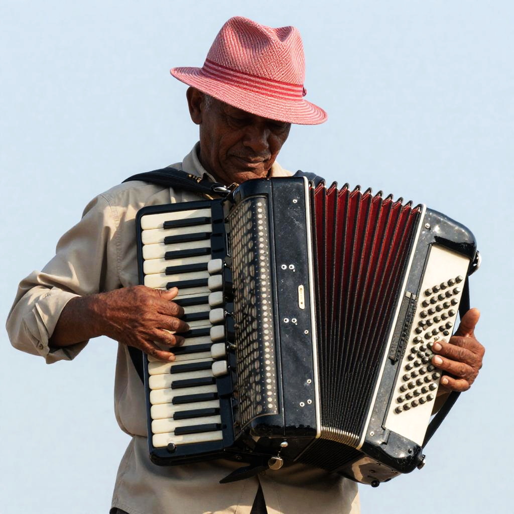 Photograph of an older man with dark skin, wearing a red and white striped hat, beige shirt, playing a black accordion with red panels. His face is partially obscured by the hat. He has a focused expression, and his hands are gripping the accordion. The background is a light blue sky. The accordion has white buttons and a curved horn on the right side.