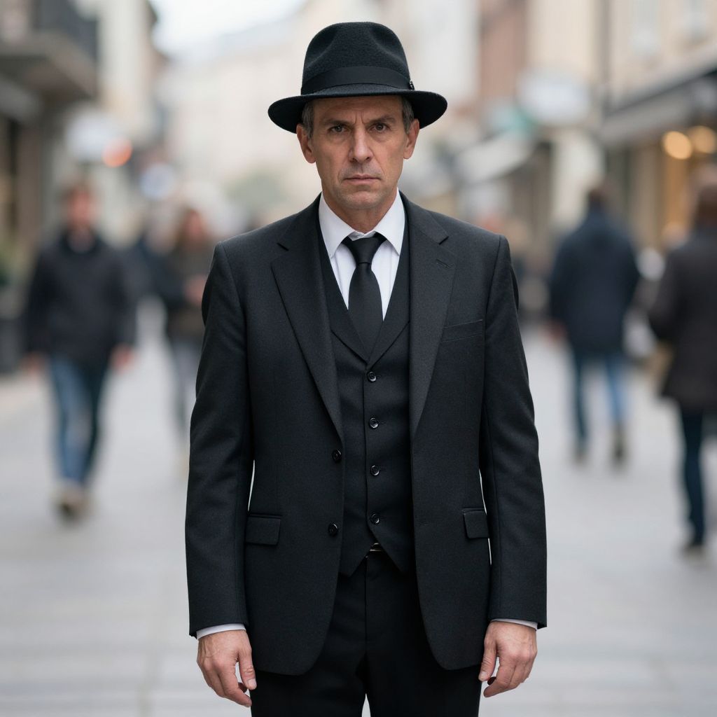 Photograph of a white man with a serious expression, standing in the center of a blurred urban street. He wears a black three-piece suit with a white shirt and black tie, complemented by a black fedora hat. His hands rest by his sides. The background shows indistinct people in dark clothing, blurred to emphasize the subject. The street is paved and lined with buildings, with bright, out-of-focus lights in the distance. The overall mood is mysterious and slightly dramatic.
