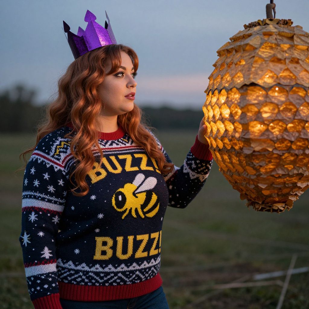 Imagine a knitted sweater of this digital artwork depicts an image of feminine curvy woman with a purple paper crown on her head looking into a bee hive at dusk, side view, uglyswe4ter, A festive holiday sweater with a image of a yellow and black bee, In stylized gold letters are the words \"BUZZ BUZZ!\", cinematic lighting, a photograph of a person with long copper colour hair, hourglass figure, wearing an uglyswe4ter looking at the camera