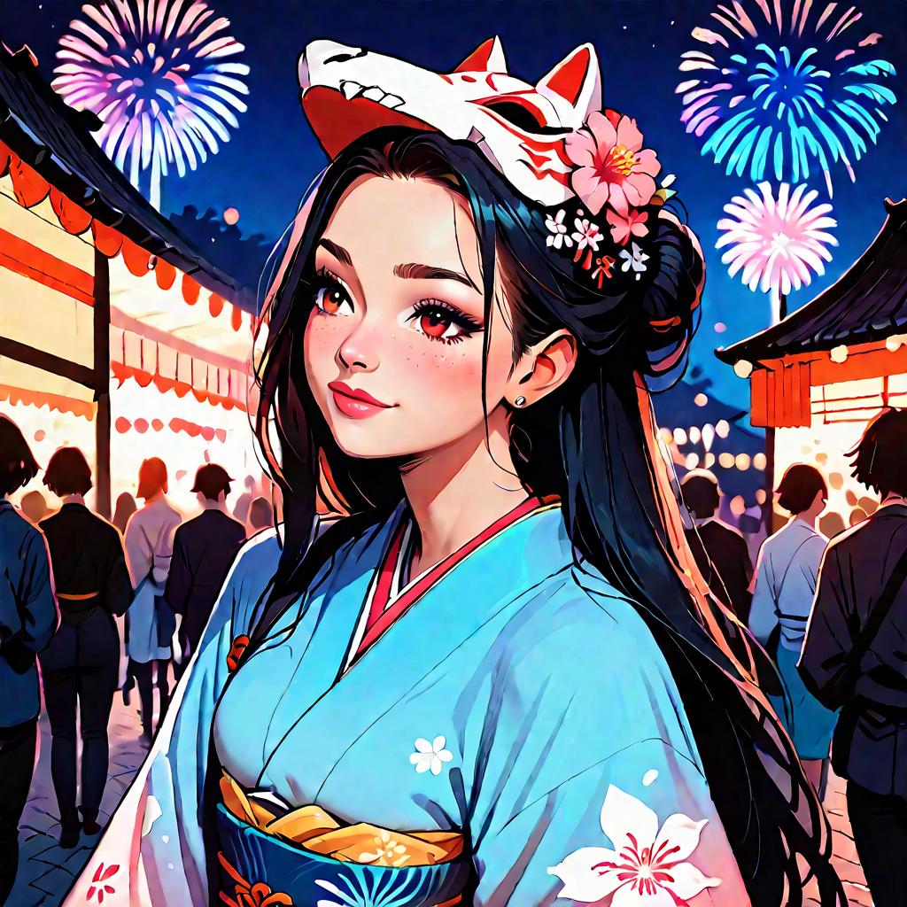 Score_9, score_8_up, score_7_up, source_anime, BaelzNewYears, long hair, hair bun, hair flower, kimono, obi, mask on head, thighhighs, outdoors, night, fireworks, festival, food stalls, smile, blush