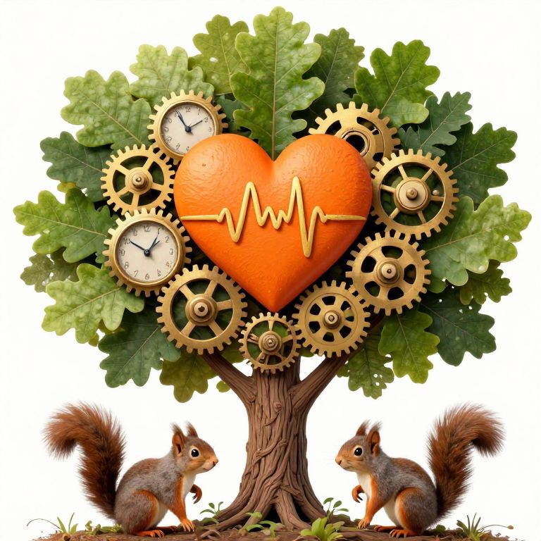 Mechanical gears intricately embedded within lush green foliage form the leaves of an oak tree, while a vibrant orange heart beats rhythmically at its center, surrounded by cascading golden clocks and cogs, all watched over by two curious brown squirrels perched on the ground beneath.