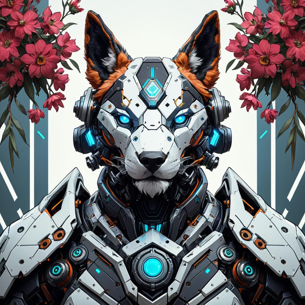 Detailed digital portrait of a hybrid robot cerberus with sharp blue glowing eyes and intricate mechanical armor. The design combines animal features with futuristic robotic elements, accented with flowers on either side. The image features a symmetrical composition with smooth, sharp focus and elegant futuristic details, inspired by concept art styles.