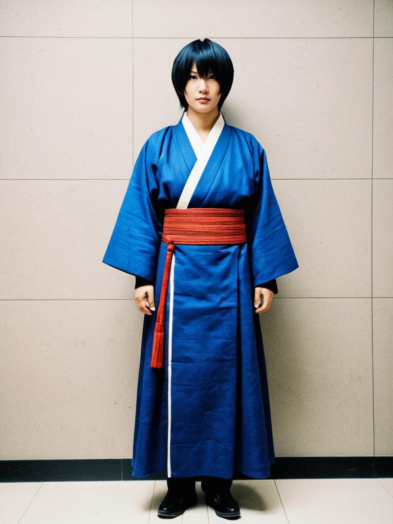 Photo-realistic cosplay photo of person in aida kensuke costume. . full body shot