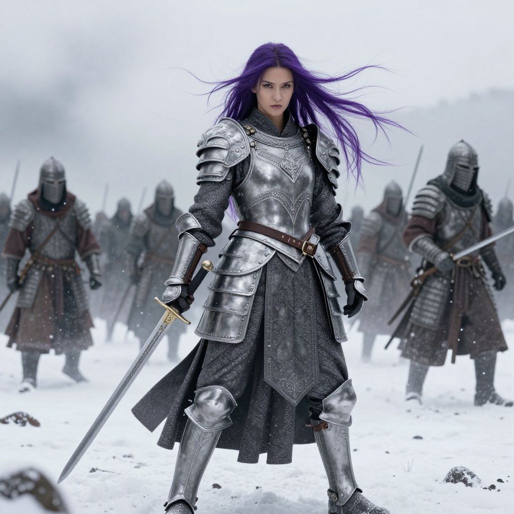 Digital fantasy artwork of a fierce, purple-haired woman in silver armor, holding a sword, standing in snow, surrounded by armored soldiers.