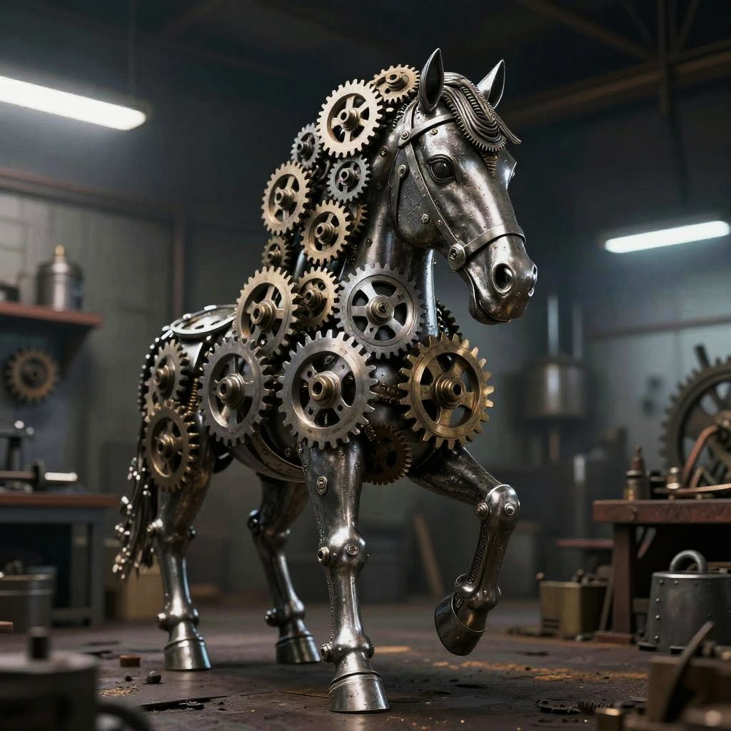 An imaginative hybrid of a stallion and a metal gears, featuring mane made of spinning cogwheels, set against a industrial workshop.