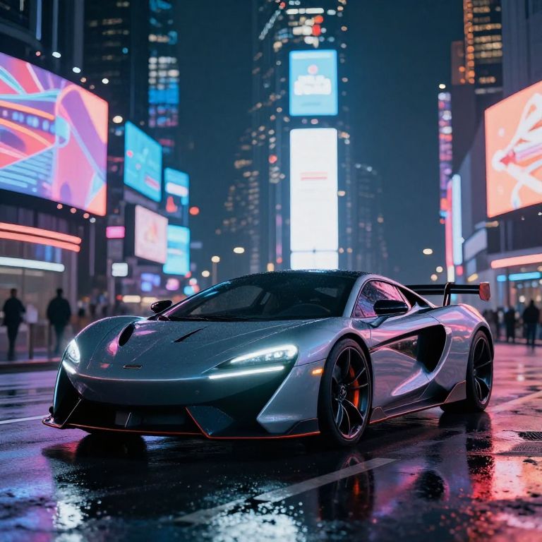 Photograph of a sleek, silver, high-performance sports car with a prominent rear spoiler, parked on a wet, reflective urban street at night. The car's headlights are on, casting a bright glow. The background features towering skyscrapers adorned with vibrant, colorful neon billboards, including blue, red, and pink lights, creating a futuristic cityscape. The street is slick with rain, enhancing the reflection of the car and lights. A few blurred silhouettes of pedestrians are visible in the distance. The overall scene has a cyberpunk aesthetic, with a high contrast between the dark night and the bright, colorful advertisements.