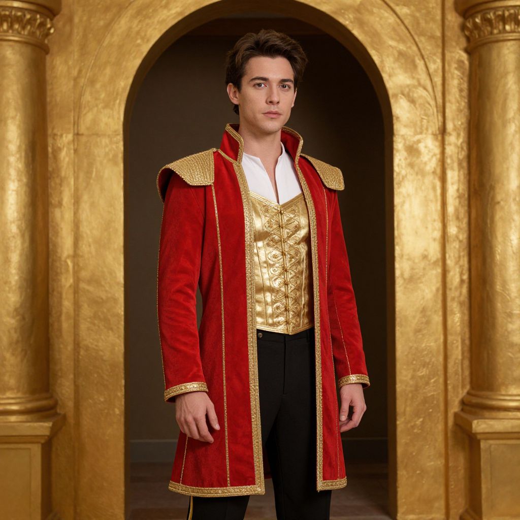 Photograph of a young Caucasian man with short, dark brown hair and fair skin, standing in a gold, archway-like frame. He wears a red velvet coat with gold trim, over a white shirt and an ornate, gold embroidered vest. His black pants contrast with the rich colors of his top. The background is dark, highlighting the gold archway and the man's detailed outfit. The image has a slightly digital, CGI-enhanced feel, emphasizing the textures and colors. The man's expression is neutral, and he stands with a relaxed posture.