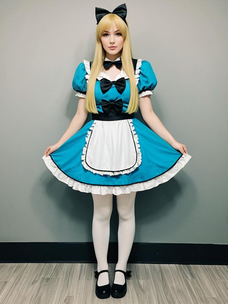 Photo-realistic cosplay photo of person in mononobe alice costume. Full body. Standing. Full length. 1girl, green eyes, blonde hair, very long hair, long hair, hair ribbon, hair bow, black ribbon, black bow, virtual youtuber, virtual youtuber
