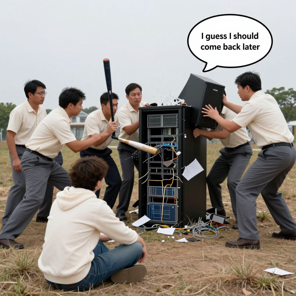 A man in a hoodie sits on the ground and sadly watches a server be destroyed by a group of office works, Middle of a field, Several office workers in short-sleeve cream button ups and slacks are smashing a server rack to pieces, One office worker is using a baseball bat, the other is kicking the server, The server rack is dented and electrical components are dangling out of the server, The server says \"civitai\" on top, Thought bubble from the man in the hoodie says \"I guess I should come back later