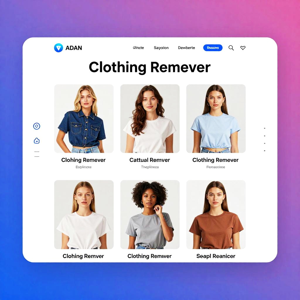 Clothing remover website homepage, modern digital art style, focusing on AI-powered fashion technology, showcasing seamless virtual clothing removal on diverse models, vibrant yet tasteful color palette, intuitive navigation with futuristic icons