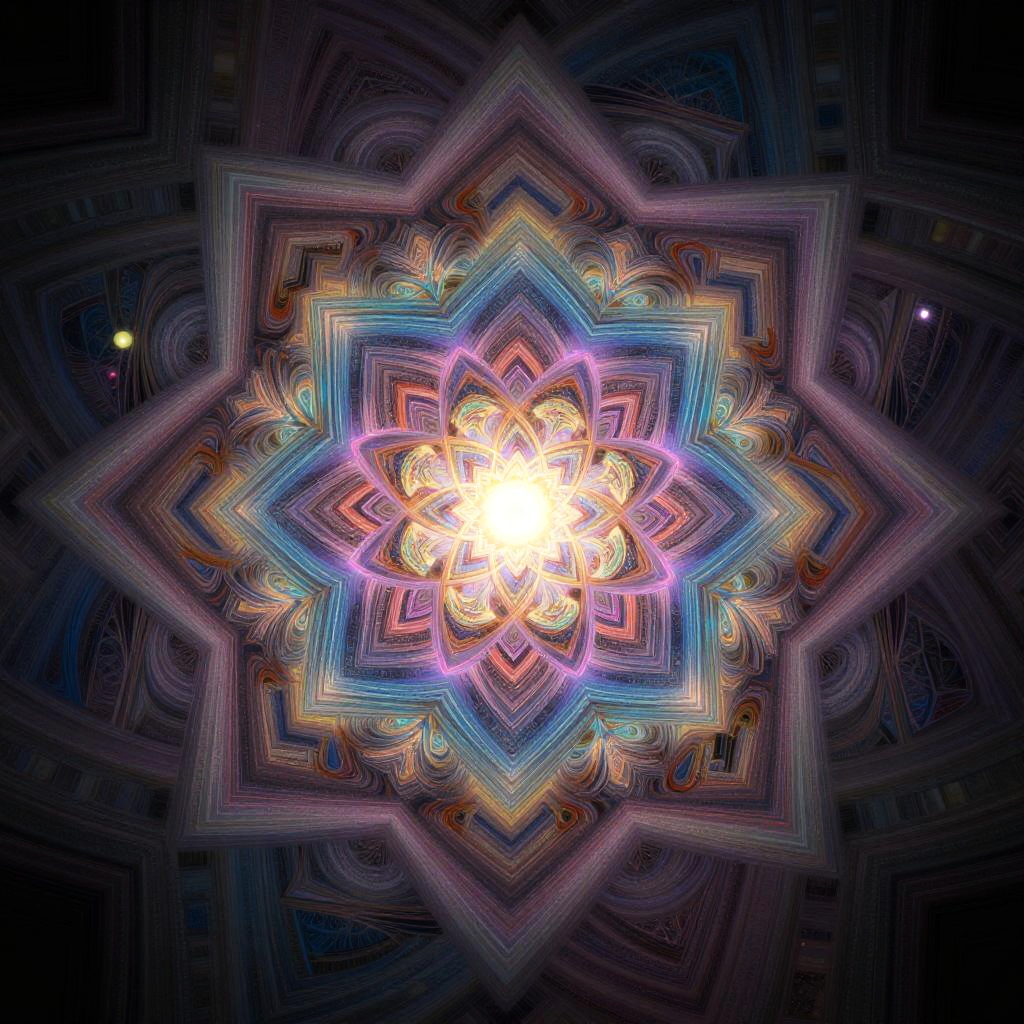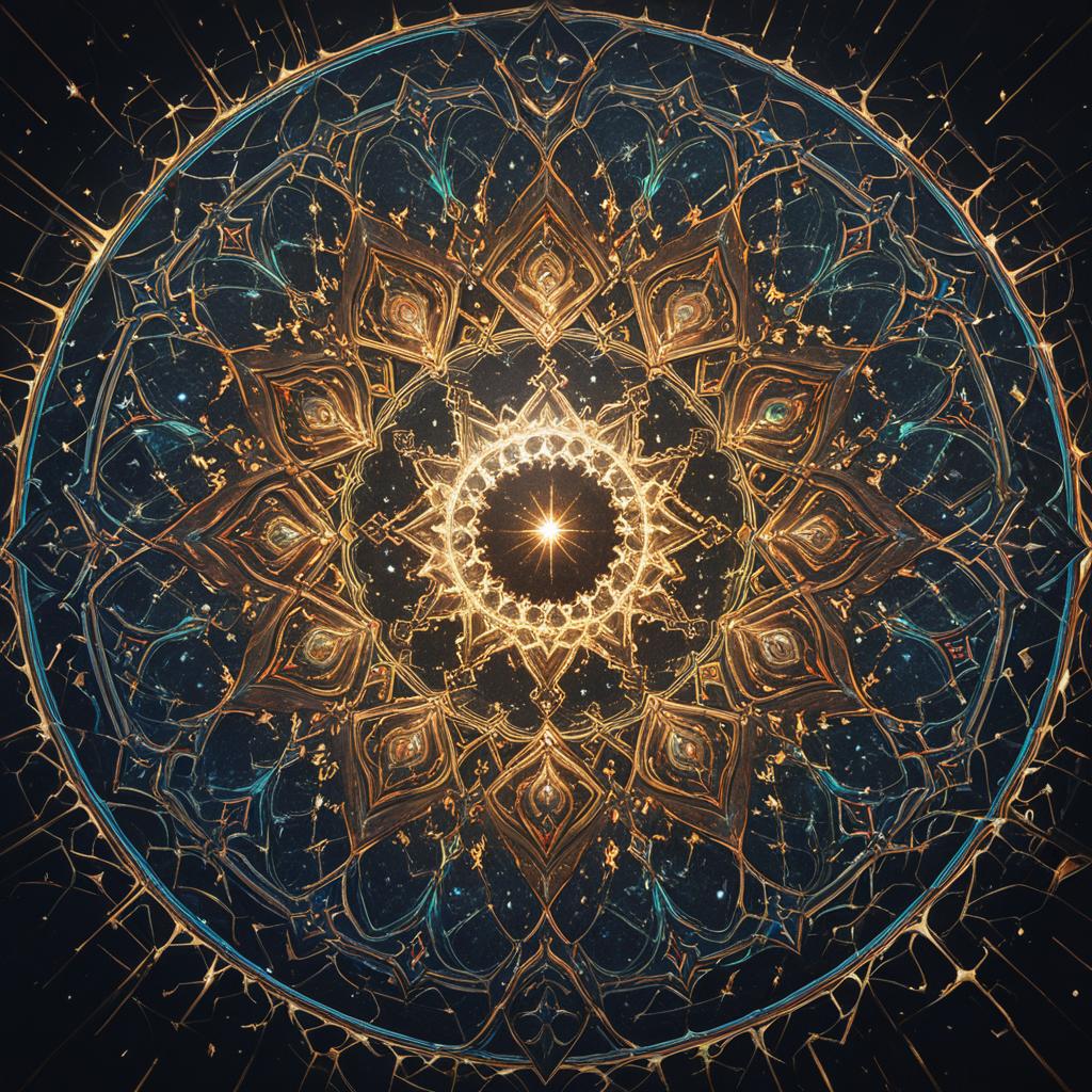 A vibrant, glowing geometric mandala featuring intricate zentangle and tangle patterns. The image showcases a symmetrical star-shaped formation with layered vivid colors and dynamic depth of field, creating a mystical and esoteric atmosphere. The design emphasizes photorealistic textures and sparkling effects, portraying an artistic blend of chaos and elegance in a brutalist style.