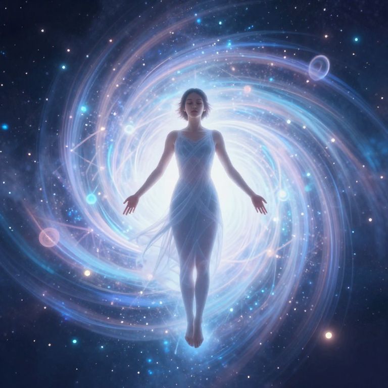 Digital artwork of a woman floating in space, centered in a glowing, swirling blue vortex. She has short, dark hair and wears a flowing, sleeveless white dress. The background is a deep blue, star-studded cosmos with several small planets visible. Her silhouette is backlit by the bright, ethereal light of the vortex, creating a halo effect. The swirling vortex, composed of light blue and white energy patterns, surrounds her, giving a sense of movement and mysticism. The overall style is futuristic and otherworldly, emphasizing her serene, almost celestial presence.
