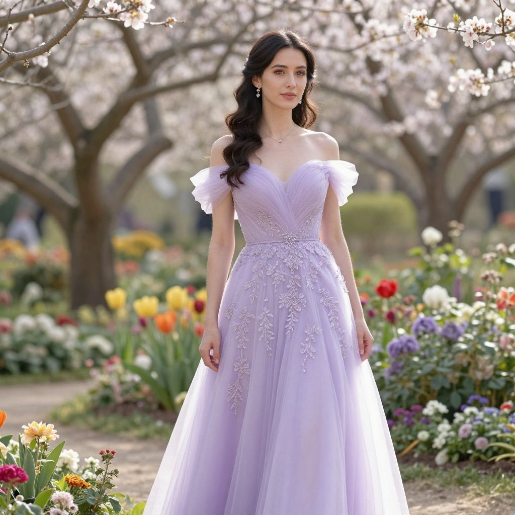 A graceful woman dressed in a stunning lavender gown stands elegantly amidst a blossoming garden filled with vibrant flowers. The soft sunlight accentuates her features and the exquisite design of her dress, creating a serene and enchanting atmosphere.