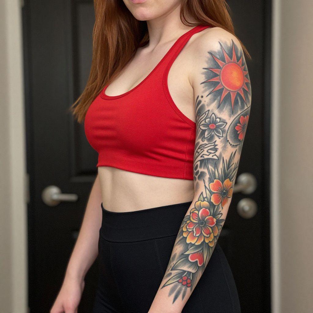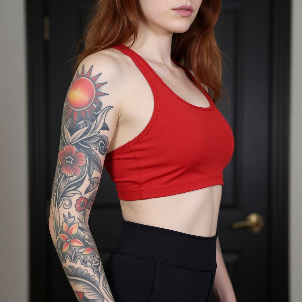 Photograph of a pale-skinned woman with long auburn hair, wearing a red sports bra and black high-waisted pants. Her right arm and left forearm are heavily tattooed with intricate black and grey designs, including a red sun and floral patterns. She's standing indoors with a dark door in the background. Her tattoos are vivid and detailed, contrasting with her fair skin and red top.