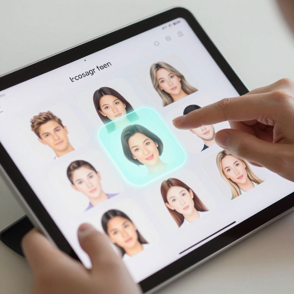 Close-up of a user engaging with a face shape app free interface on a digital tablet, clean user experience layout, showing multiple face shape options in glowing icons, translucent overlays, bright cheerful tones, tech-savvy atmosphere