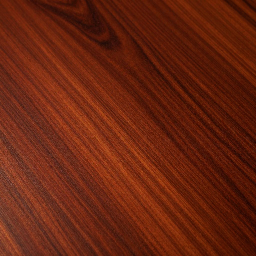 Wooden table texture captured in high detail, rich cherry wood with reddish-brown tint and distinct natural streaks, slightly glossy lacquered finish, close-up under warm artificial lighting to enhance wood’s warmth and grain complexity