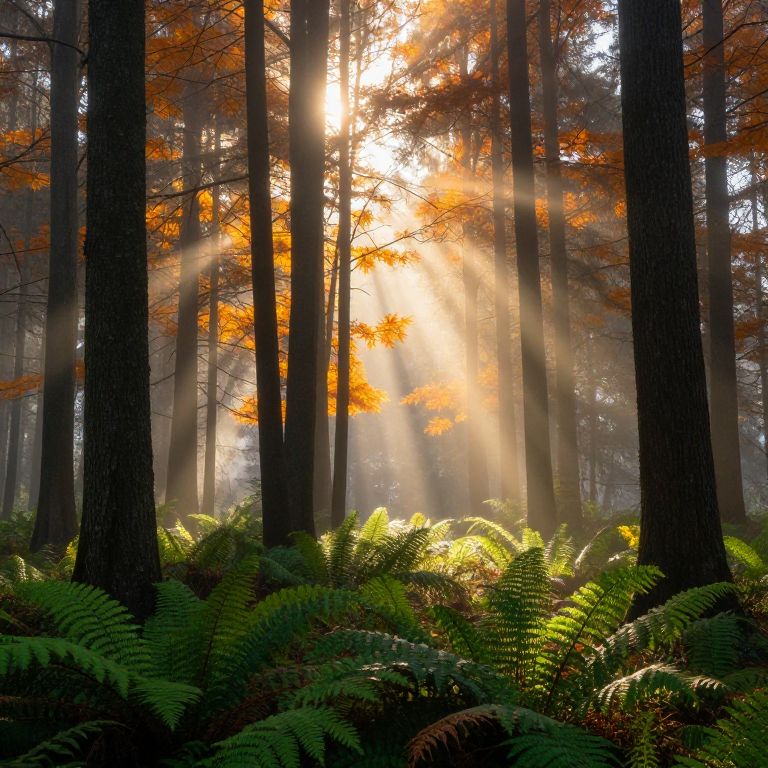 Photograph of a sunlit forest, showcasing tall, dark brown trees with orange and red leaves. Sunbeams pierce through the canopy, creating a radiant glow and casting light beams across the scene. The forest floor is covered in lush, green ferns, with their intricate fronds illuminated by the sunlight. The background is filled with more trees, creating a dense, serene woodland atmosphere. The light and shadows create a dramatic contrast, emphasizing the natural beauty of the forest. The overall mood is tranquil and majestic.